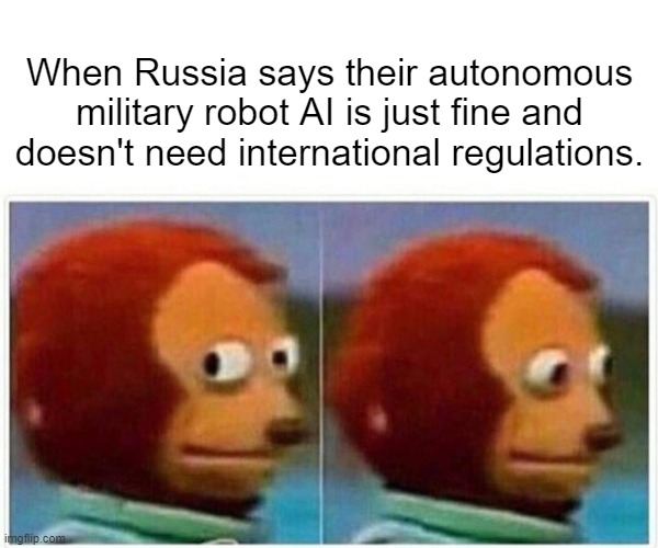 The argument from Russia is that the AI algorithms driving these killer robots are already advanced enough to differentiate friend from foe from civilian, and that therefore there’s no need to burden the autonomous death machines with unnecessary regulations. Uhhh…..